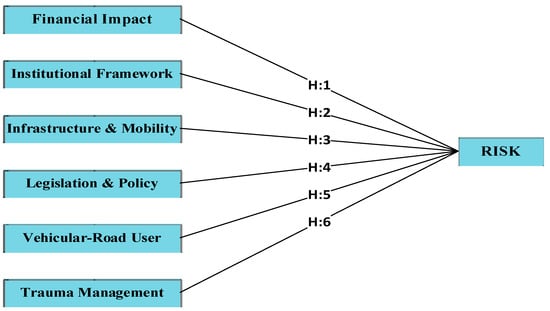 Trauma management is related to the system responsible for rapid response to the medical treatment of injured people in the crashes []. The facility of trauma management is connected with the availability of medical treatment for the survival of life after crashes. Especially in developing countries, injury crashes result in fatalities. Researchers have concluded that 50% of fatalities occur during the crashes while others are within a few hours of the crashes []. If a proper medical facility is available, then the risk level of the country can be improved by reducing fatalities. Pharmacare and medical treatments, and in time availability of medical aid and proper hospital emergency treatment as a chain process, can not only save lives but also disabilities []. The conceptual model is shown in Figure 4.