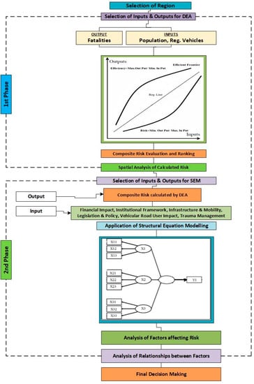 The purpose of this study was to investigate the road safety condition of low and middle-income countries of the Asian region. In particular, the focus was to analyze six major sectors which are directly related to road safety conditions. A detailed literature review directed towards a two stage methodology to analyze the road safety condition of Asia by first calculating the risk value of all countries and, then, to develop the relationship between risk and factors contributing to risk increment. DEA, as one of the benchmarking tools to calculate risk was adopted, and after calculation, ranking was done to idealize the risky countries within the Asian region. In second phase PLS-SEM, was used a structural output mechanism to visualize a large set of variables in relation to the risk level. Road traffic accidents are, nowadays, the most incessant reason of injuries and fatalities. Guidelines to adopt the variables and development of constructs were followed by available WHO [] patterns and similar formats of analysis were adopted. In the background, the target was studying the major contributing factors of road traffic crash fatalities [,,]. Studies are available regarding road crashes associated with high speeding, unfastened seat belts and disobeying other road conducts causing many crashes []. The study was based on the financial condition of countries (so per capita income) which was the punching variable for analysis, but the major focus was on the institutional framework as it was related to financial planning and target execution. Infrastructural development and major transport policy-making decisions for mobility were also taken into consideration. Road safety audit mechanisms, promotion of public transport, and promotion of cycling were also within this periphery. Trauma management, which remained a crucial factor (significant factor as shown in SEM based analysis) for road safety researchers was taken as a major construct variable. Trauma management is related to two major factors, i.e., efficient injury surveillance systems and control of permanent disabilities by in-time medical treatment. So fatalities can be reduced by improving trauma management.