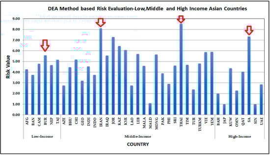 After calculating Risk value from the DEA method, Asian countries have been ranked according to the risk level of these countries. A risk value of 1 was idealized as one the best values to be considered as one of the finest and safest countries of the region, while going above that point provides the hint of risk and a country with the 8.53 being the highest value and considered as the most risky. The graphical representation of results is shown in Figure 8 (arrows showing the most risky within groups) and a GIS-based risk map has been drawn to visualize the risk value pattern of countries as shown in Figure 9.