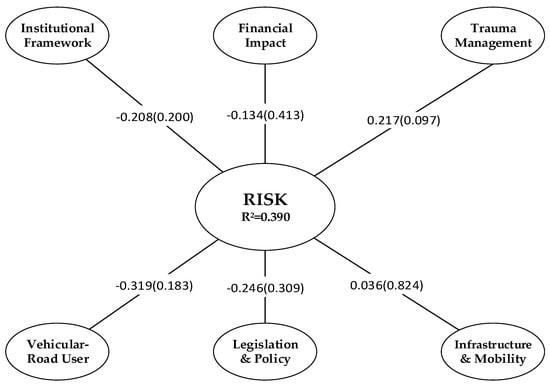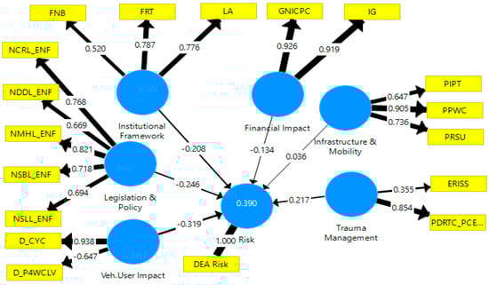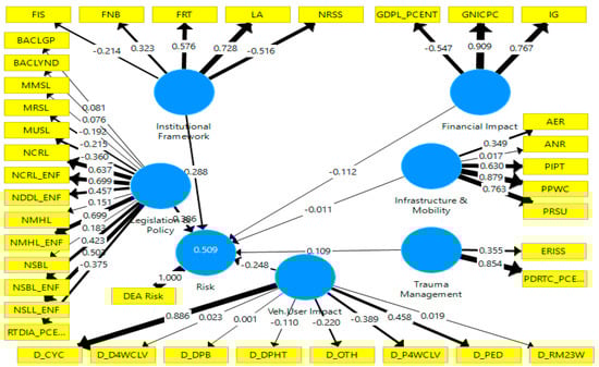 In the second phase, PLS-SEM technique is selected to analyze the relative impact of the factors affecting the risk. Smart PLS-SEM is suitable for a small sample size and does not require normal distribution []. PLS-SEM technique provides an advantage to prioritizing all the factors on their relative importance basis. The developed conceptual model was strained in Smart PLS software [,] for simulation work in assessing the effect of manifest variables (inhibiting factors) on road safety performance. PLS simulation of the model is applied by evaluating and considering certain parameters, which include factor loading, reliability, and validity tests. The pattern of each construct and factor is shown in Figure 10 for analysis. This construct of research has been followed on the basis of WHO data patterns.