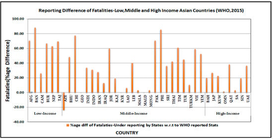 Road safety problems and life loss are two interrelated issues and are related to economic factors i.e., direct economic costs and indirect economic costs []. The direct cost includes medical, legal emergency and property-related damages, while sometimes it goes on if these factors have continuity []. From the analysis, we can observe that the lower and middle-income countries are already striving for their survival and have less attention focused towards road safety problems, so there is no monitoring mechanisms in those countries for road safety. However, in high-income countries, lack of implementation is the major issue. Institutional framework is also not backed by a strong budget and presence of a lead agency to deal with road safety situations and to implement safety strategy and fatality reduction target. A proper framework is a needed to deal with the road safety situation and risk level []. The World is focusing on reducing traffic fatality by 50% (five million fatalities and 50 million serious injuries) by the end 2020 [], but Asian countries are still not focused to target maintaining the previous level []. Asia has one of the biggest issues of legislation and policy. There are laws for the speed limit, motorcycle helmet and seat belt but still, implementation and management are an issues. Asia is still fighting to focus on these three major legislative issues, on the other hand, child constraints are still not under consideration in a large number of countries. Trauma management is related to the system responsible for rapid response to the medical treatment of injured people in the crashes []. The facility of trauma management is connected with the availability of medical treatment for the survival of life after crashes. Especially in developing countries, injury crashes result fatalities due to unavailability of medical facilities, i.e., lack of trauma management. Researchers have concluded that 50% of fatalities occur during the crashes while others are within few hours of the crashes []. If a proper medical facility is available, then a risk level of the country can be improved by reducing fatalities. Pharmacare and medical treatments, in time availability of medical aid and proper hospital emergency treatment as a chain process, can not only save lives but also disabilities []. During the analysis, as shown in Figure 16, the most alarming is the fact that there is a large difference between the State-reported and WHO-reported fatalities, i.e., under-reporting by the State database. This difference of figures varies between 0% and 88% which is an alarming fact. This under reporting involves many factors (i.e., (1) fatality reporting definition and recording (2) deliberate under reporting (3) lack of proper management systems for data collection (4) trauma Management, etc.).