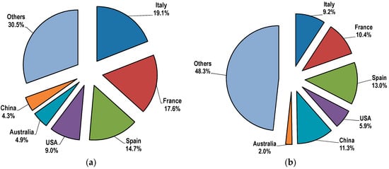 Wine production countries in the world in terms of wine amount produced (a) and Vineyards surface in wine production countries (b) (elaborated from OIV [3] data).