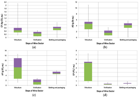 The main results of the papers that consider all the life cycle phases are reported in Figure 3 in terms of the environmental impact category considered and the wine sector phase. In particular, four environmental impact categories were common to all the studies: Carbon Footprint (CF), Abiotic Depletion (AD), Acidification Potential (AP) and Eutrophication Potential (EP) (more details about the impact categories are in Section 3.3) Three main wine phases have been considered: viticulture, vinification and bottling/packaging.