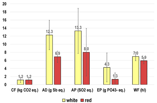 Although for the carbon footprint, the environmental performances of the two wine types are very similar, for the other impact categories this is not true (Figure 4). In fact, for the other impact categories, the red wines seem to be more environmentally sound. Nevertheless, the results of the studies are affected by a very high variability. Therefore, it is difficult to define what type of wine is more sustainable from an environmental point of view. The results’ variability for a single wine type (as shown in Figure 4 by error bars) is greater than the difference between the environmental performances of white and red wines (Figure 4) and the different authors do not agree.