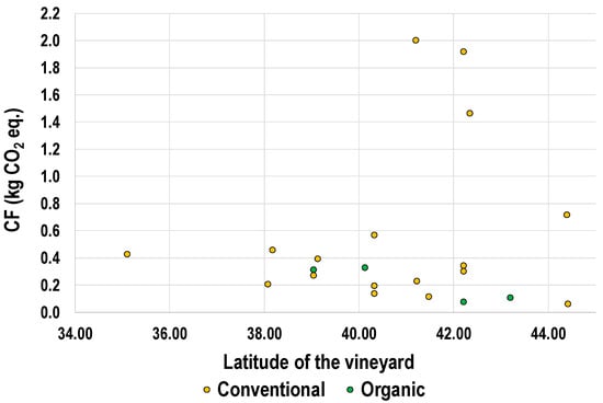 As shown in Figure 5, the geographical position of vineyards in terms of latitude, instead, does not seem to be a factor that can affect the environmental performances of the viticulture phase with regard to the greenhouse gas emissions.