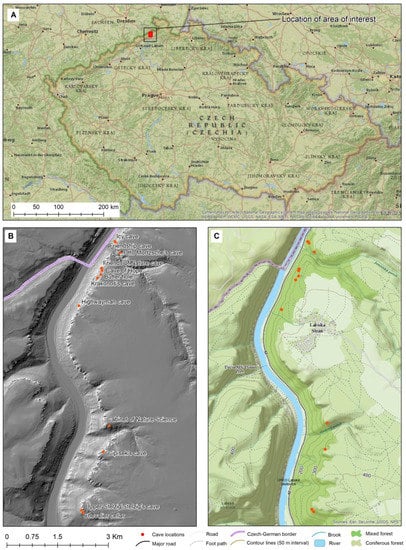 The area of interest lies in the NNR Kaňon Labe (Labe Canyon), and it is part of the larger PLA Labské pískovce (Elbe Sandstone Mountains). A list of analyzed caves is provided in Table 1, and Figure 1 shows the map of the locality.