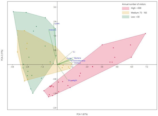 Previous research on cave microbial communities indicates that caves serve as reservoirs of unique and non-described species. Protection of these ecosystems is therefore of interest for biodiversity preservation [7,36]. Although the effect of visitors on microbial communities overall is positive, from a nature conservation point of view, where unaffected and natural ecosystems should be protected, the observed effect is negative. Tourist traffic represents a significant influence on natural ecosystems; moreover, in a highly protected nature area (National Nature Reservation—NNR) (In the legislative of the Czech Republic “National Nature Reservation” presents a very strict form of natural protection and is defined by Act no. 114/1992 Coll., on Nature and landscape protection as amended (in Czech “Zákon ČNR č. 114/1992 Sb., o ochraně přírody a krajiny, v platném znění”)). Even though the highest attendance determined in the area is two orders of magnitude lower compared to caves serving as a touristic magnet ([8]—200,000 visitors annually), we propose taking measures to regulate the number of allowed visitors in the caves. The key question is the acceptable number of visitors. Unlike other studies comparing visited and restricted caves [7], in this area there was no similar cave with zero attendance available for comparison. Therefore, the recommendation can only be derived based on comparison of low-traffic caves and high-traffic caves. To highlight the visitors’ effect, we have therefore focused our attention on samples most affected by visitor activity, i.e., to samples compacted by trampling (ignoring non-trampled samples). The samples were divided into three categories based on the annual number of visitors in the caves (low ≤ 30, medium 31–499, high ≥ 500); an approach similar to that described by Ikner et al. [8]. These three groups present a compromise resulting from the number of analyzed caves and distribution of their annual attendance values. Principal component analyses of PLFA data (Figure 2) revealed a similar pattern of data variability for low and medium traffic caves in contrast to different patterns of high traffic caves. If we assume the effect of low attendance as acceptable, we can therefore accept the medium attendance as acceptable. This comparison indicates that the possible acceptable limit of visitors could lie in the “medium” range, i.e., below its upper limit of 165 annual visitors. The results will be presented to local authorities and management of the Protected Landscape Area Labské Pískovce.