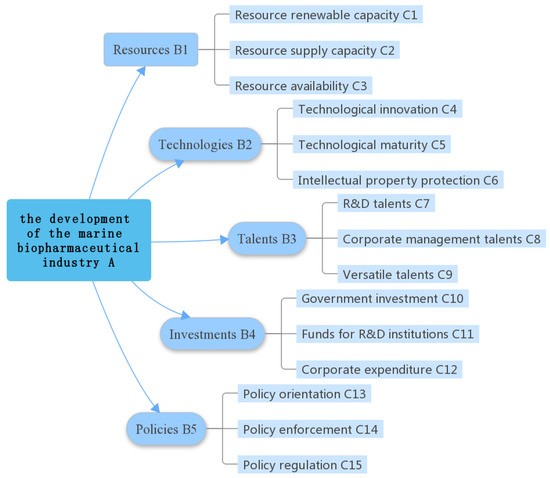 Figure 1. Hierarchical structure model of factors that influence the development of the marine biopharmaceutical industry.