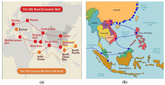 Figure 2. (a) Map of the 21st century Marine Silk Road; (b) Map of Maritime Silk Road between China and the countries from ASEAN.
