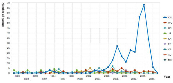 In the 1970s, China put marine biomedicine R&D on the agenda, and the existing achievements are remarkable. According to the data in the Soopat [26], China’s marine drug patents have ranked first in the world since 2006 (Figure 3).