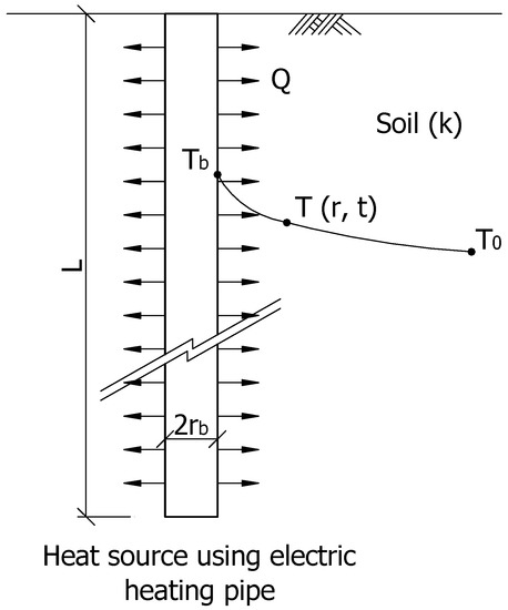 The change of ground temperature by the ground heating is estimated by Kelvin’s linear heat-source model, which is applied to a ground heat exchanger in Figure 1 [17]. If the linear heat source is infinitely long, the heat flux is constant and the initial temperature is , the temperature distribution in the ground is as shown in Equation (1),