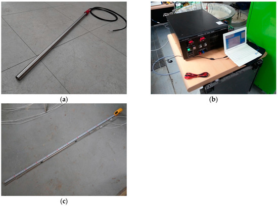 The electrical heating pipe used in this study, as shown in Figure 2a, has a total length of 60 cm, which has a heating section of 55 cm and a nonheating section of 5 cm, with a diameter of 22.7 mm. The electric heating pipe was supplied with a constant direct current by using a DC power supplier (Figure 2b). In the experiment, an electric heating pipe consumes electric power of about per hour, and the surface temperature is 500 °C. A resistance temperature detector (PT100) was used as a thermometer, and the temperature measurement range was 0 to 700 °C measured at intervals of 10 min.