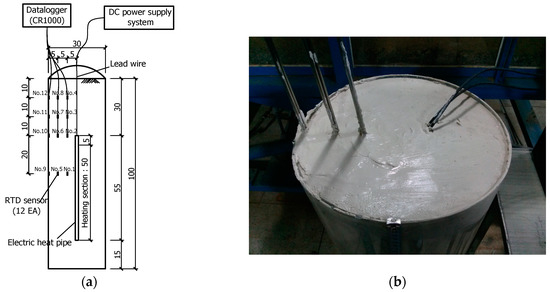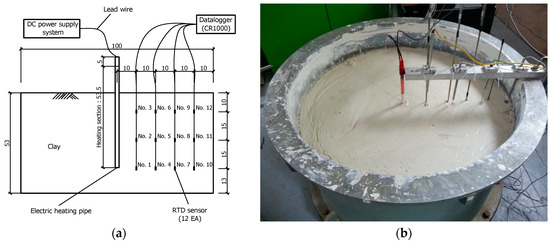An electric heating pipe with a total length of 58.5 cm was interpenetrated and installed 40 cm deep into the middle of the soil box filled with the standard clay. The thermometers were positioned in four rows at a 10 cm interval in the horizontal direction and in three columns at 10 cm, 25 cm and 40 cm depths from the surface in the vertical direction (Figure 3).