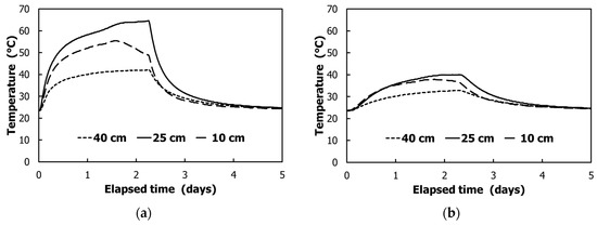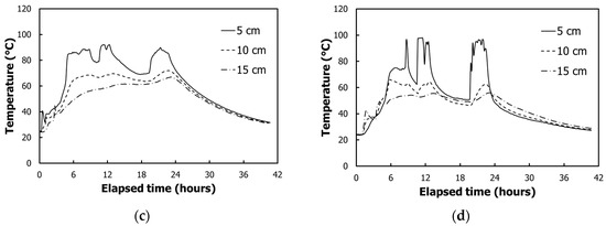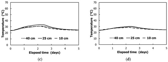 Figure 4 shows the temperature changes according to underground depths. Figure 4a shows temperature changes in sensors installed 10 cm away in a horizontal direction from the heat source at the respective underground depths. Temperature changes were almost the same, but the lowest temperature change was recorded at spots 40 cm away from the heat source, while the greatest temperature change was observed at the underground depth of 25 cm. Figure 4b–d shows the temperature changes in the sensors installed 20 cm, 30 cm and 40 cm from the heat source in a horizontal direction at each underground depth. The largest temperature variation was recorded at the ground depth of 25 cm, as seen in Figure 4a.