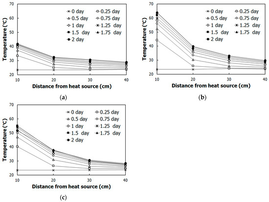 Figure 5 shows the experimental results of temperature changes in horizontal distances from the heat source. The temperature change from the heat source was larger than the 10 cm point at 20 cm depth in the ground and increased up to maximum 64.61 °C. The reason why the temperature change at 10 cm is small is that heat energy is lost due to the discharge of water vapor near the surface.