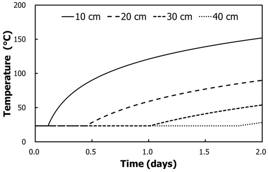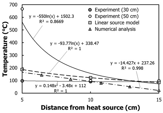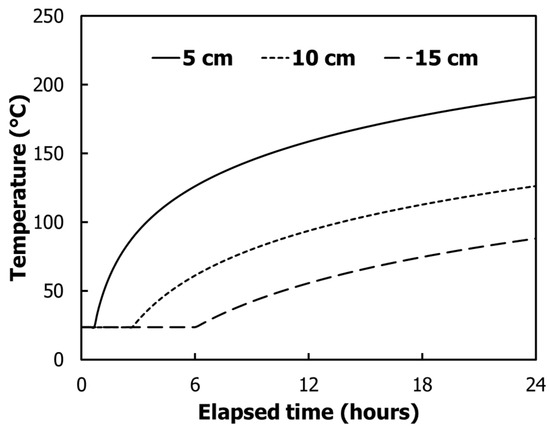 Figure 6 shows the results of comparison of temperature changes over time by the linear heat-source model. At a point 10 cm away from the heat source in the horizontal direction, a temperature change occurred after about 4 h, and increased to about 150 degrees. The temperature increased to about 100 degrees at a distance of 20 cm.