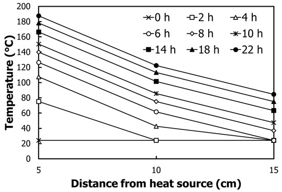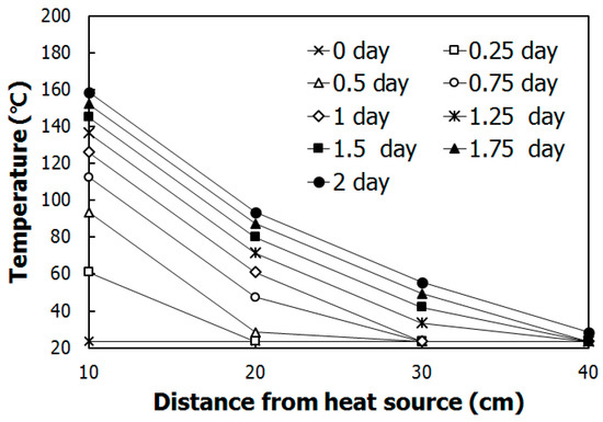 Figure 18 shows temperature changes in 22 h of heating by horizontal distances from the heat source. At a depth of 30 cm above 5 cm in the vertical direction from the heat source, the highest temperature change occurred, and increased to a maximum of 667.6 °C. This result is caused by the heat transfer by water vapor, because clay with a small permeability does not generate the flow of pore water. The temperature increased only up to about 100 °C at 50 cm, which is the same depth as the heat source. As a result, the heat transfer of the saturated clay was shown to be transmitted more vertically by water vapor than in the horizontal direction. Unless water vapor caused loss of heat energy, the experiment showed larger temperature change than the linear heat-source model and numerical analysis.