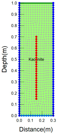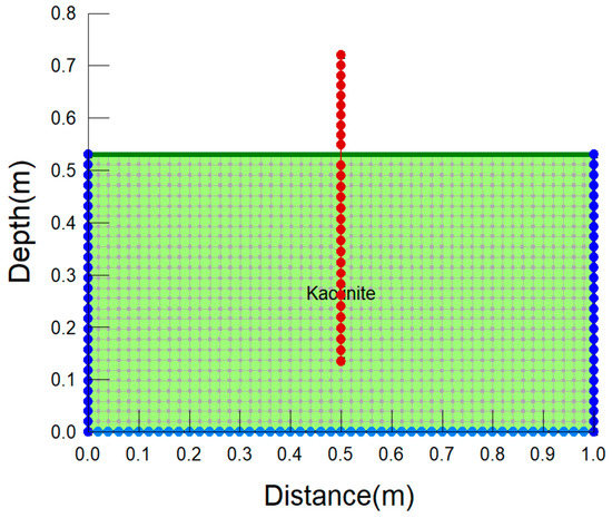 Figure 8 shows the numerical model applied to heat-transfer analysis (case 1). The cross-section of the numerical analysis model is the same as the cross-section of the experiment in Figure 3. The mesh size is 0.02 m, considering the electrical conductivity and the analysis time. The initial conditions and the boundary conditions of the numerical model were applied to the temperature measured in the experiment. Firstly, the initial temperature of kaolinite is 22.75 °C, and the temperature of the interface of the soil box is 23.48 °C. In Figure 8, the nodes at the left and right boundaries are blue circle, and the bottom is sky blue circle. The temperature of the electric heating pipe, which is a heat source, is of electric power supplied from the DC power supplier, and the surface heating temperature is 500 °C. In Figure 8, it is a red circle.