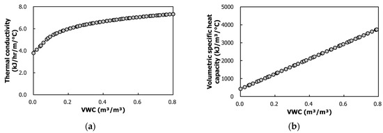 The heat-transfer characteristics of the soil applied to numerical analysis. (a) Volumetric water content (VWC) vs. thermal conductivity curve; (b) volumetric water content (VWC) vs volumetric specific heat capacity curve.