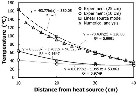 Figure 10 shows the results of comparison between the linear heat-source model, numerical analysis and the experiment results. Temperature changes according to horizontal distances from the heat source were observed after two days of ground heating. The linear heat-source model showed the highest temperature difference, followed by the numerical analysis and the experiment. The experiment showed the lowest temperature, due to heat loss by water-vapor discharge. The analysis of temperature changes in a horizontal direction from the heat source showed the results in a quadratic function form, and the linear heat-source model and the numerical analysis showed a constant decrease. Because of the increased loss of heat energy due to the discharge of water vapor near the surface, the temperature change was 25 cm higher than the 10 cm depth.