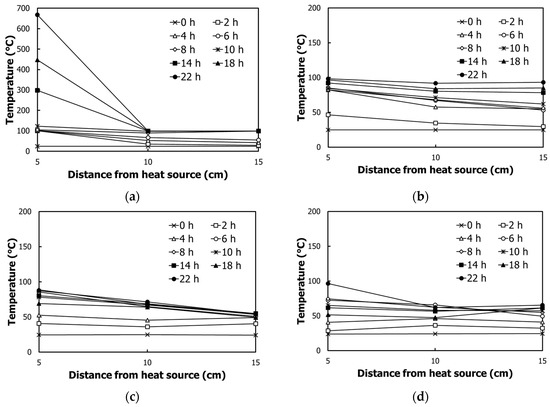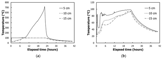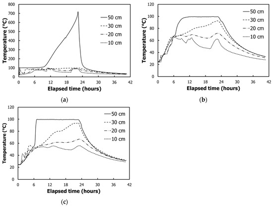 Figure 13 shows the temperature changes depending on underground depths according to horizontal distances. Figure 13a shows the temperature changes depending on underground depths at a horizontal distance of 5 cm from the heat source, Figure 13b at a horizontal distance of 10 cm, and Figure 13c at a horizontal distance of 15 cm. The middle point of the electric heating pipe (50 cm underground) showed a rapid temperature increase to up to 718.8 °C. The experiment with vapor-discharge suppression had relatively greater temperature changes in 22 h of heating than the experiment with vapor discharge, and showed temperature increases of about 60–100 °C. The irregular temperature-change curve means that vapor was moved to the surface in an irregular way. Also, in case of vapor-discharge suppression, heat transfer by vapor occurred, increasing the temperatures at all underground depths by less than 100 °C.