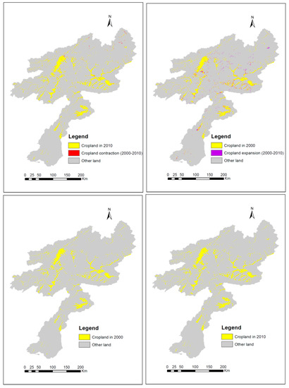 Changes in the spatial distribution of cropland during the period of 2000 to 2010.