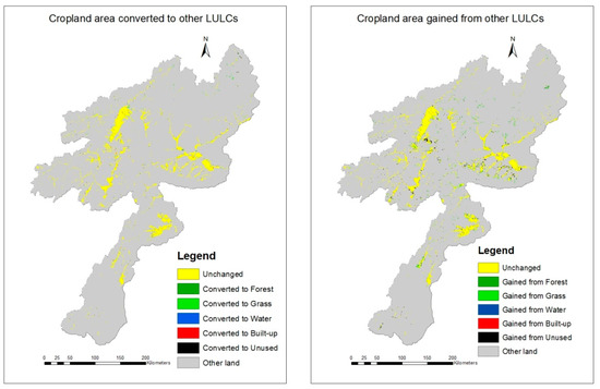 The significant exchange of cropland in KRB happened after 2000 with all the land use types, particularly with grassland, unused land, water bodies, and built-up land. More than 80% of the converted cropland was shared by grassland and unused land (Figure 2). This was possibly due to the water stress situation in some parts of the country due to climate change, as indicated by Savage et al. [70]. The remaining areas of cropland conversion are mostly shared by water bodies and built-up, indicating that the cropland were damages by flood and increasing urbanization. As for the gained part, cropland mainly gained areas from grassland, unused land, and forest implying that the agricultural expansion happened with expenses to the natural lands, such as grasslands and forest areas.