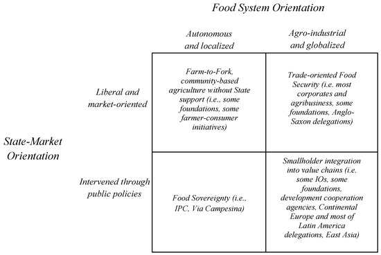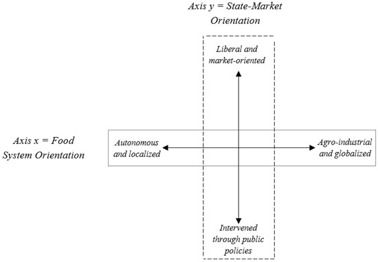 - State-market orientation (axis y) refers to actor’s opinions on the role of states and markets in organizing food systems. The extremes are:The liberal and market-led orientation considers the private-sector as the driver of agricultural growth and, ultimately, agricultural development. State intervention is relevant, but should be oriented toward facilitating private investments in economically-efficient agricultural activities. This can take the form of regulating (or de-regulating) labor and land markets, facilitating transactions, for example, by ensuring property rights, juridical security and lowering transaction costs. In this perspective, food security can be achieved by pursuing trade-oriented strategies, if trade is conducted with less barriers and more emphasis on economies of scale;The intervened through public policies orientation does not disregard the importance of market forces in organizing agricultural production, processing and distribution. Nevertheless, it considers that markets constantly fail in their allocation role and that public policies are vital for orienting food systems. In this sense, the state, as the operator of public policies jointly negotiating with broader societal constituencies, continues to assume a regulatory role in similar terms as the liberal and market-led orientation, but assumes more active roles. These include: (i) providing rural public goods; (ii) protecting local production from international competition; (iii) supporting smallholder farmers with extensions, inputs and credit; (iv) protecting marginal farmers from land and resource expropriation; (v) reducing land concentration by agrarian reforms, among others. Trade can be an engine for complementing food security, but only if it “governed”, meaning when it does not come into contradiction or when it is used to support other government policies.