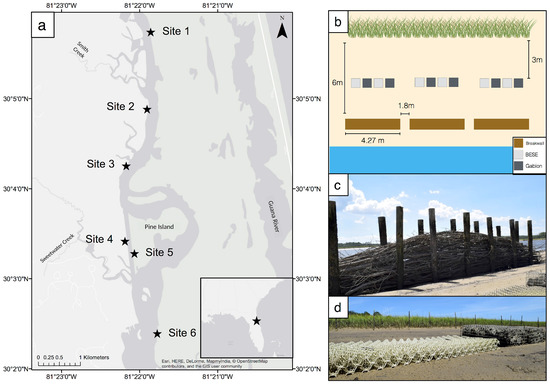 Overall site map: (a) Map of six study sites along the Intracoastal Waterway in Ponte Vedra Beach, FL, USA; (b) diagram of experimental set up (representing one treatment) showing wall length, spacing between walls, and distance of breakwalls and oyster restoration structures from the shoreline; (c) photograph of breakwall; and (d) photograph of oyster restoration structures showing BESE on the left and an oyster gabion on the right.