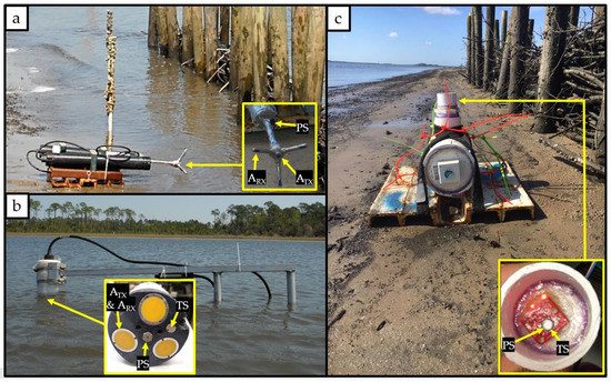 Wave instruments with sensor closeups: (a) Vector; (b) a mounted PCADP; and (c) PEARL. , Acoustic Receiver; , Acoustic Transmitter; PS, Pressure Sensor; and TS, Temperature Sensor.