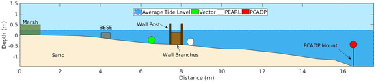In March 2017, the Vector was placed 0.66 m behind the center of the southward wall set with the probe 10.16 cm above the ground. It recorded waves from 22 March 2017 to 25 March 2017 (Figure 3). During this period of time, the breakwall height was 30 cm. For the next experiment in July, the wall height was increased to 60 cm. PEARL was placed 42 cm in front (seaward) of the center wall, while the PCADP was placed 8.53 m in front and 1.22 m north. The pressure sensors for PEARL and the PCADP were located 25.4 cm and 1.04 m above the ground, respectively. PEARL recorded from 13 July 2017 to 16 July 2017 and the PCADP recorded from 13 July 2017 to 17 July 2017.