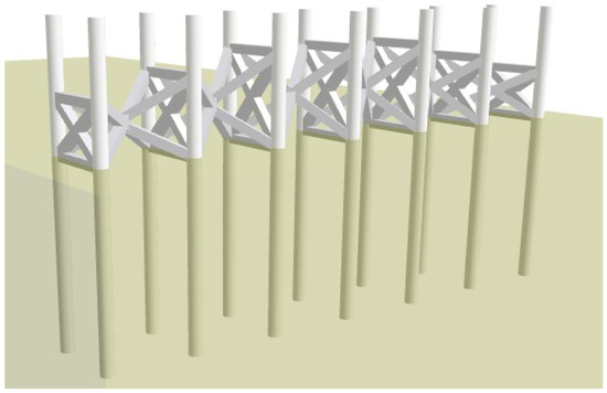 Models of the breakwall were developed to investigate their stability under wake loading. The model in Figure 4 consisted of fourteen 2 m long piles with properties of southern pine (E = 13.7 GPa, = 100 MPa, = 58.4 MPa, = 0.65) embedded about 1.3 m below the mudline with two-dimensional beam elements attached to the piles [34]. The beam elements have properties of crepe myrtle (E = 10.8 GPa, = 97.4 MPa, = 64.1 MPa, = 0.71) [34]. The subsurface soil stratigraphy was determined through invasive Standard Penetration Tests (SPT) where physical samples were used to estimate soil stiffness and strength properties via SPT blow counts. Within the depths of interest, the stratigraphy can be described as 8–10 cm of soft loose silts and clays, followed by 1.8 m of loose to medium dense fine sand with silt, and finally underlain by 0.9 m of very loose sandy clay. Soil density, modulus, and strength estimates based on the blow counts were used to model the axial and lateral soil-pile interaction. The axial and lateral capacities were calculated according to methods for timber piles to be 1.22 kN of axial and 1.24 kN of lateral loading for a single pile [35]. The soil was treated as saturated due to the wall location at high and low tides.