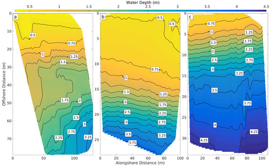 Bathymetry with depth (m) contours: (a) Site 1; (b) Site 3; and (c) Site 4. Please note the differences in offshore distances captured at each site.