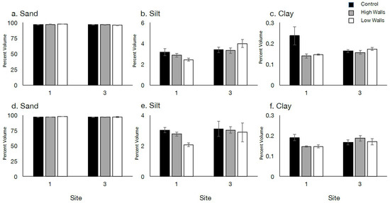 Bathymetry is largely influenced by the type of sediment present [42]. Sites 1 and 3, similar to all sites, had very similar sediment compositions dominated by sand (∼97%) followed by silt (∼3%), with trace amounts of clay (<0.25%) (Figure 7a–f). At both sites, no significant differences in sediment grain size composition between treatments were found in samples collected at the lower intertidal zone or at the marsh edge, verifying that the sediment composition did not vary significantly among treatments at the start of the experiment.