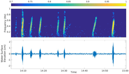 Boat wakes can be identified in the spectrogram of pressure time series by their distinct chirp structure, with the instantaneous frequency increasing monotonically in the range of 0.05 Hz to 1 Hz, depending on the depth and type of vessel generating them (Figure 8) [31].