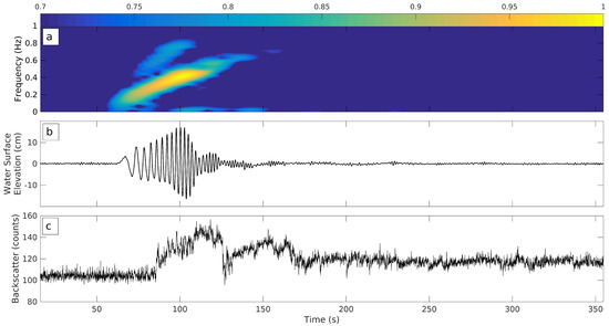 This boat wake occurred on 25 March 2017 at 8:13 a.m., when the water depth was 1.08 m: (a) wave spectrogram with normalized density color bar; (b) pressure plot; and (c) backscatter plot.