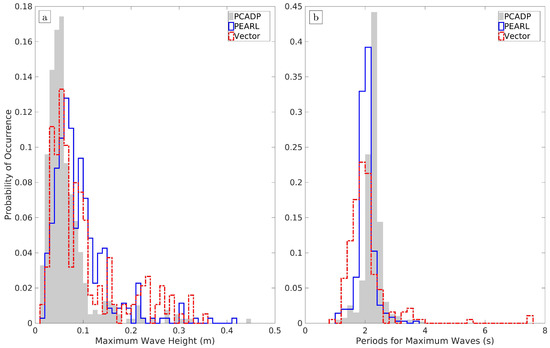 Wave statistics: (a) Probability histograms for maximum wave heights recorded by PEARL, the PCADP, and the Vector; and (b) probability histograms of periods over which the maximum wave occurs for PEARL, the PCADP, and the Vector.
