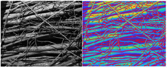 where A is the cross-sectional area of the breakwall half-cylinder and is the diameter of branch j, with . However, allowance is made for the bias of the algorithm as well as the fact that each image only contains information about the visible branches in the visible part of the breakwall. To correct for these errors, three factors were introduced: is a factor that compensated for specularity in the estimate of the branch diameter (the true diameter was times the diameter estimated using the edge detection algorithm); represents the ratio of image height to the circumference of the half-cylinder, i.e., the height of an image is equal to ; and, finally, branches are seen inside the breakwall only to a depth of times the mean branch diameter. It is difficult to establish the values of these three factors. These factors were given assumed values of , , and = 2.