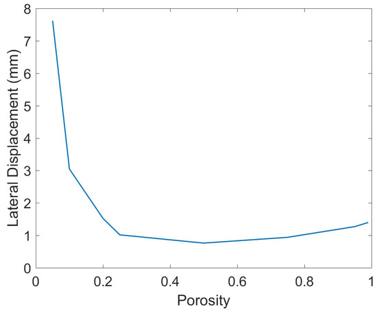 Lateral displacement versus porosity for a single node on a post at the end of the breakwall.