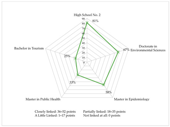 The results obtained by the first questionnaire showed that the environment axis, in terms of knowledge, skills, attitudes and values, is closely linked (81% or 42 points) to the curricula of High School No. 2, but not to the curricula of the Bachelor in Tourism (25% or 13 points) or the Master in Public Health (33% or 17 points). The Doctorate in Environmental Sciences and the Master in Epidemiology were partially linked to the environment axis with 67% or 35 points, and 58% or 30 points, respectively (Figure 1).