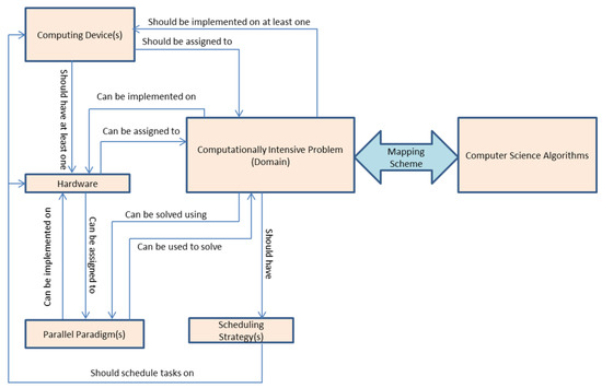 A mapping scheme from the problem domain to the computer domain should be clearly identified. For this purpose, ontologies can be developed by describing entities from one or multiple domains and relations among these entities [10,11]. Ontologies are recognized as conceptual information models that describe the entities in a specific domain, such as classes, relationships and functions [12]. In this paper, we present an ontology in the domain of High-Performance Computing (HPC) and show how an ontology-based approach may be used to solve computationally-intensive problems on heterogeneous architecture.