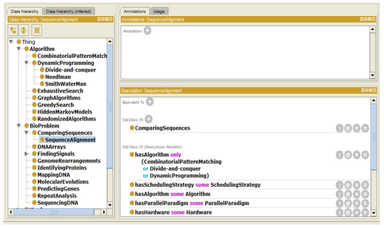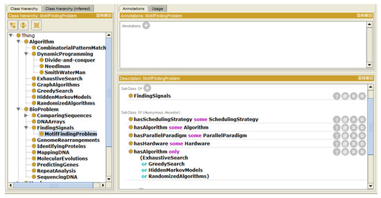 Classes are interpreted as sets that contain individuals. They are described using formal (mathematical) descriptions that state precisely the requirements for membership of the class. The class tree contains one class called owl:Thing, which is superclass of everything. We have created five disjoint subclasses: “Algorithms”, “BioProblem”, “ComputingDevice”, “Hardware”, “ParallelParadigm”, and “SchedulingStrategy”.