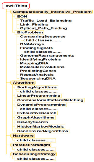 Many ontological reasoning-based approaches have been presented so far to address the challenges related to HPC and parallel computing. For example, a framework as an integrated solution of parallel computing and ontological reasoning is presented in [13]. It can be used on scalability issues in parallel computing by using ontological reasoning. An ontology learning-based framework to address scalability issues in parallel computing is presented in [14]. Similarly, an ontology-drive solution for cloud service handling and discovery is presented in [15,16]. In [17], the authors present an ontology editor (i.e., ONTOLIS) that can be used for concept mapping and inferencing for better content coverage in Big Data and HPC courses. In [18], the authors present a parallel ABox reasoning algorithm for increased scalability in HPC and parallel computing environments. computationally-intensive problems may be treated and solved as self-contained problems by identifying hardware, software and scheduling strategies, depending on the complexity and nature of the problem. Ontologies can play a significant role in mapping domain concepts to an inferencing environment and suggesting the best possible solutions at run time. Due to the diversity of domains and involvement of multidirectional software and hardware, very little work has been undertaken on solving computationally-intensive problems on heterogeneous architectures by designing and using ontologies.