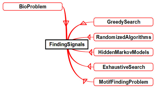 Figure 4. Instance “Sequence Alignment”. - Instance “MotifFindingProblem”The motif-finding problem is one of the most famous bio problems. It is classified under “FindingSignals”. It can be solved using exhaustive or greedy searches, hidden Markov models or randomized algorithms (as described in Figure 5).