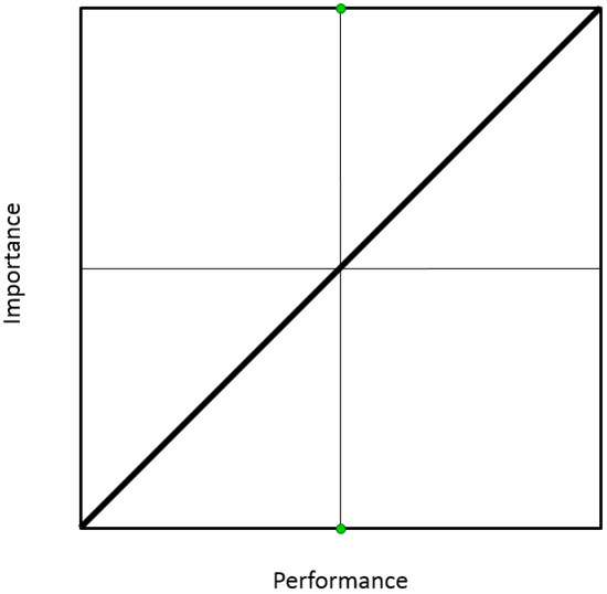 In Figure 1, a diagonal line is incorporated into the IPA grid. This line is called the iso-rating or iso-priority line and indicates where importance equals performance [48,55,56]. This line separates the graph into two areas. All negative gap points above the diagonal line indicate where management attention is required because importance exceeds performance. Positive gap points plotted below the line indicate that performance of an attribute exceeds the importance. This also means that there is already a high performance with relatively low importance, so no extra management attention is required. By plotting the importance-performance gap scores against the diagonal line, the gap analysis provides an indication of whether the focus and resources are being utilized adequately, insufficiently, or ineffectively [57].