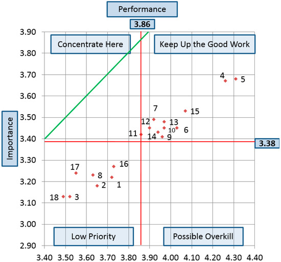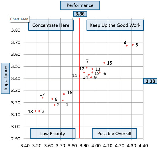 Interpretation of the IPA plot is straightforward [52]. Attributes that are important to customers, but that have fairly low-performance levels are classified into Quadrant 1, “Concentrate here”. Placement in this cell suggests that improvement efforts are necessary. Quadrant 2, “Keep up the good work”, displays attributes that are perceived to be very important to customers, and simultaneously, that the organization performs well. Some attributes may fall in Quadrant 3, “Low priority”, because both importance and performance ratings of the attributes are lower than the average. These items are likely to receive a low priority in resource allocation decisions. “Possible overkill” in Quadrant 4 specifies that the attributes falling in this area are relatively less important, but that the company performs well on these attributes.