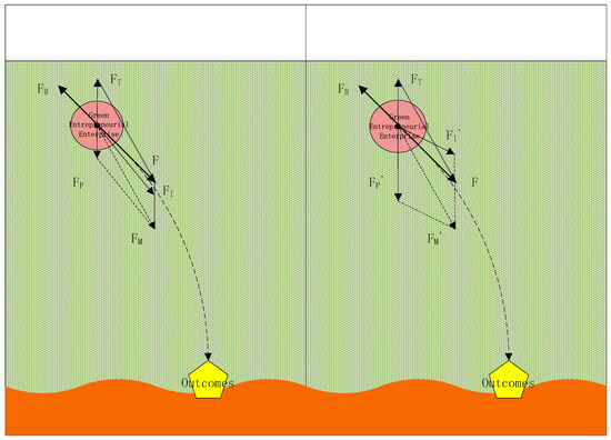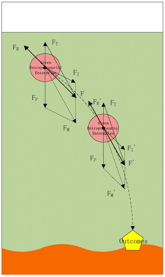 If an entrepreneurial enterprise is likened to a uniform, solid sphere of water and related policies as external environmental factors are viewed as a field, then the role of policy support, FP, for entrepreneurial enterprises can be compared to the gravitational force, G, that the sphere is subjected to. Similarly, for green entrepreneurial enterprises, policy support, like gravity, is a downward force. In other words, the force of policy supports in promoting enterprises’ innovation and brings them closer to the green product and technology development. The supportive role of policy support for green entrepreneurship is related to the intensity of policy support, that is, the intensity of the incentives, subsidies and tax relief provided by the relevant policies. From the perspective of R&D subsidies, research and development costs plus deductions, scientific research awards and so on, the intensity of impact on the entrepreneurial enterprise is related to its input and achievement in green entrepreneurship. Based on this, we use FP in Figure 2 to express the force of policy support received by green entrepreneurial enterprises.