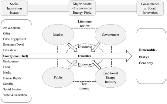 Intensified social and economic problems or issues, such as those relating to economic development, energy, environment, food, health, security, social services and water and sanitation, tend to bring about social consensuses on tackling such challenges, which increasingly promote calls for extensive social change. The depletion of fossil fuels, the risks of nuclear power and climate change, as formidable challenges facing contemporary modern societies, urge each country to make fundamental and systemic societal changes by addressing socio-technical transitions, especially energy, for a shift towards a more environmentally sound and sustainable economy. A socio-technical transition focused on energy-related issues involves reconfiguring different socio-technical sub-systems or societal domains [], which entails interactions between various actors, agents, or stakeholders in a society [,,] and which involves various patterns and pathways [], different phases [], public discourse and high levels of co-evolution, complexity and uncertainty [,].