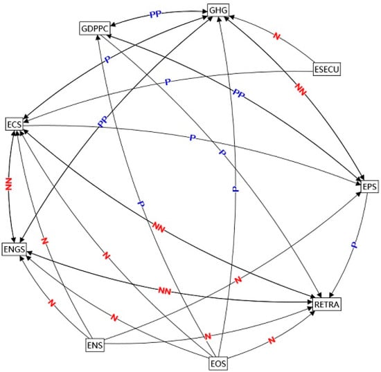 As presented in Table 6, seven variables, including one lagged dependent variable, significantly affect the transition to a renewable-energy economy. The LSDVC estimation results of Table 6 show evidence of dynamic effects in all bias-corrected LSDV estimations; the dependent variables (e.g., , ) depend on their values in the previous period (e.g., , ) at 1% significance levels, by demonstrating that a null hypothesis where each coefficient equals zero can be rejected at 1% significance level and that each coefficient is a positive sign. The results from panel causality tests presented in Panel B of Table 6 find that  and  have positive effects on , that  and  have negative effects on , that  negatively affect , that  has a positive effect on , that  and  negatively affect and  positively affects , that  and  have negative effects on  and that  and  have a positive and a negative effect on , respectively, at 1%, 5% and 10% significance levels. However, any significant direct relationships between  and ,  and ,  or ,  and  or ,  and , ,  or  do not exist (The complex dynamic casual relationships between the variables are also presented through Casual Loop Diagram (see Figure 2) drawn based on the results of LSDVC (Initial AB)-based panel causality tests).