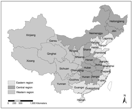 China is characterized by a fast-growing economy with three regions, which are defined based on Figure 1, where there are 12 provinces/municipalities in the Eastern region: Liaoning, Beijing, Tianjin, Hebei, Shandong, Jiangsu, Shanghai, Zhejiang, Fujian, Guangdong, Guangxi and Hainan. There are 9 provinces/municipalities in the Central region: Heilongjiang, Jilin, Inner Mongolia, Shanxi, Hunan, Anhui, Hubei, Henan and Jiangxi. There are a further 10 provinces/municipalities in the Western region: Xinjiang, Tibet, Gansu, Qinghai, Chongqing, Sichuan, Ningxia, Shaanxi, Guizhou and Yunnan.